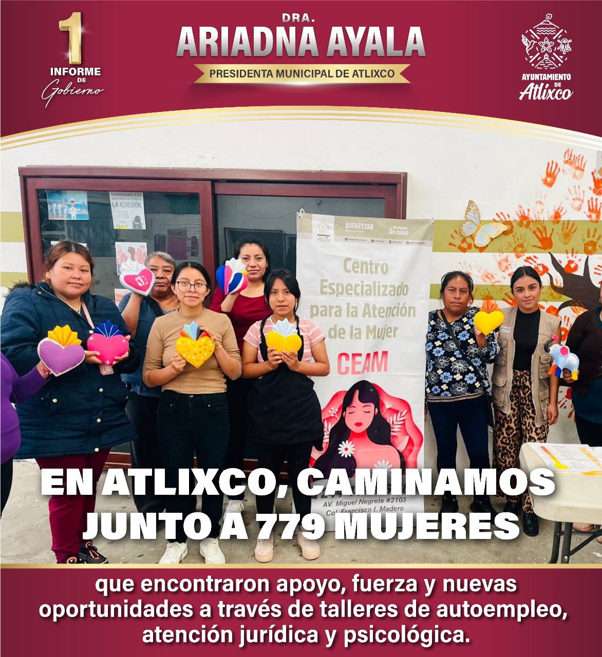 Durante su primer año de gobierno, la presidenta de Atlixco Ariadna Ayala destacó los avances del Eje 4 del Plan Municipal de Desarrollo, enfocado en el bienestar y la reconstrucción del tejido social.