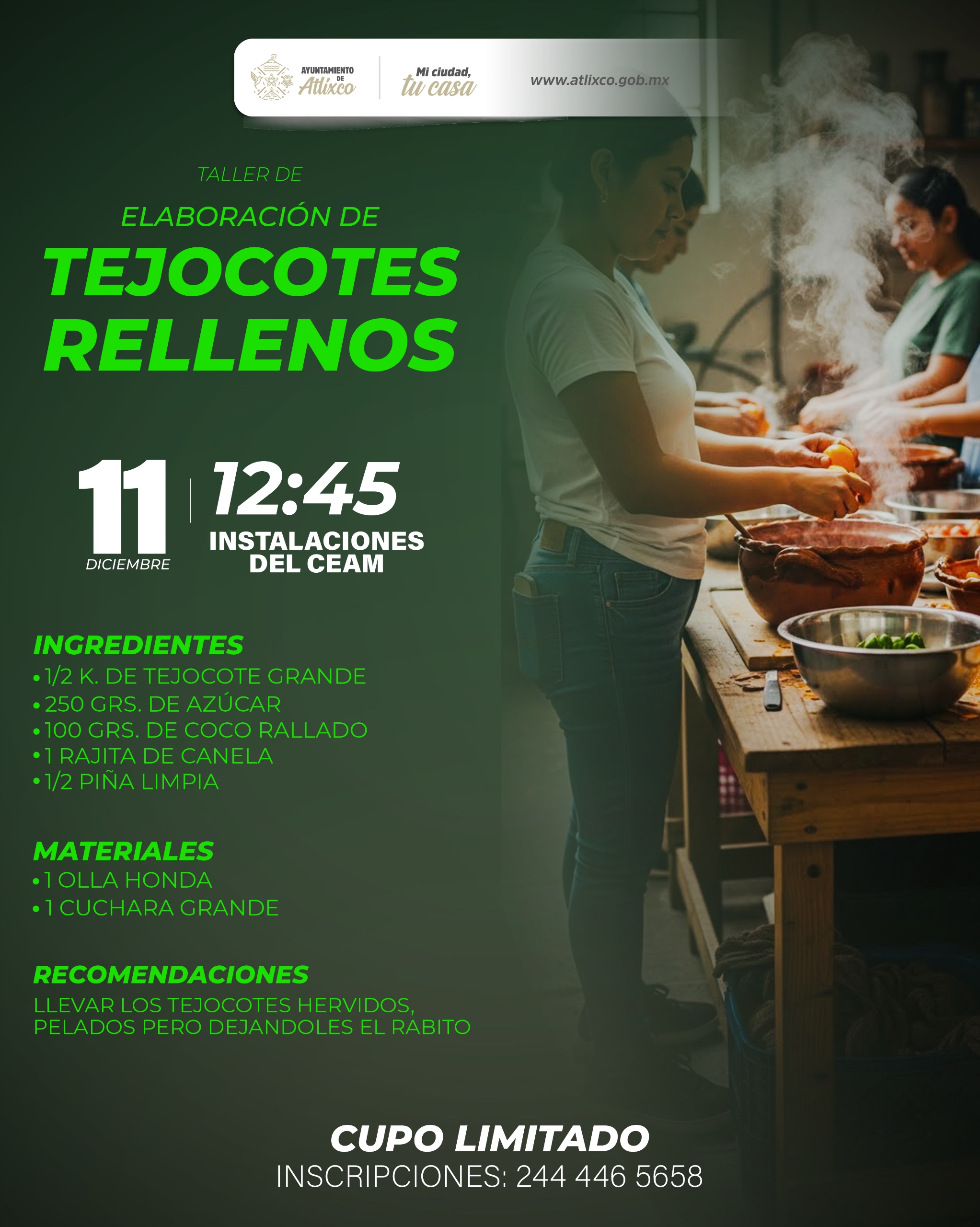 A las 11:00 horas, el equipo del CEAM impartirá el taller de polvorones sevillanos, para brindar herramientas prácticas a las asistentes; más tarde, a las 12:45 horas, se llevará a cabo el taller de Tejocotes rellenos. El cupo es limitado y las inscripciones se realizan al 244 446 56 58.