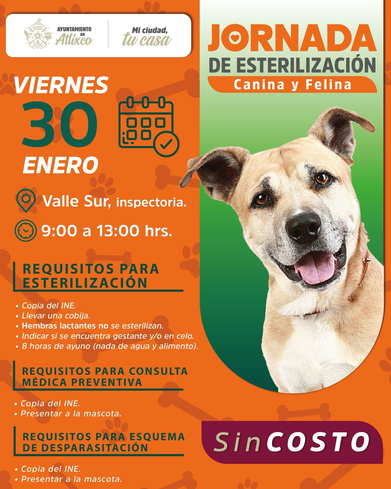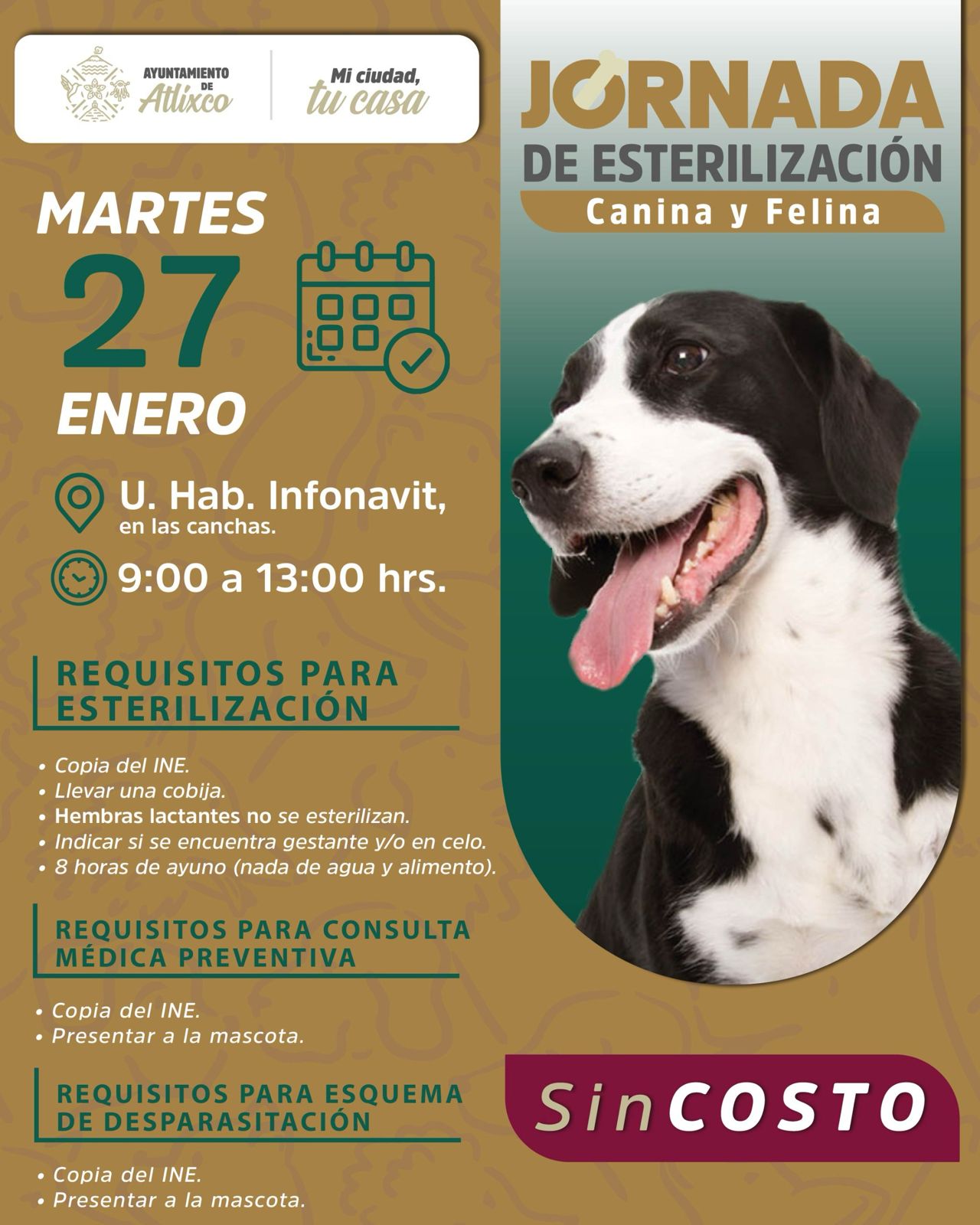 Para el servicio de esterilización, se solicita que las mascotas cumplan con ocho horas de ayuno y no sean hembras lactantes o en celo; además, se deberá presentar cobija y copia del INE del propietario. Para consulta médica preventiva, únicamente se requiere copia del INE.
